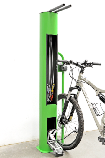 Multifunctional bike repair and maintenance station Biki is meant to tune different types of bicycles and make repairs. The tools are supplied and locked with a reinforced steel wire.