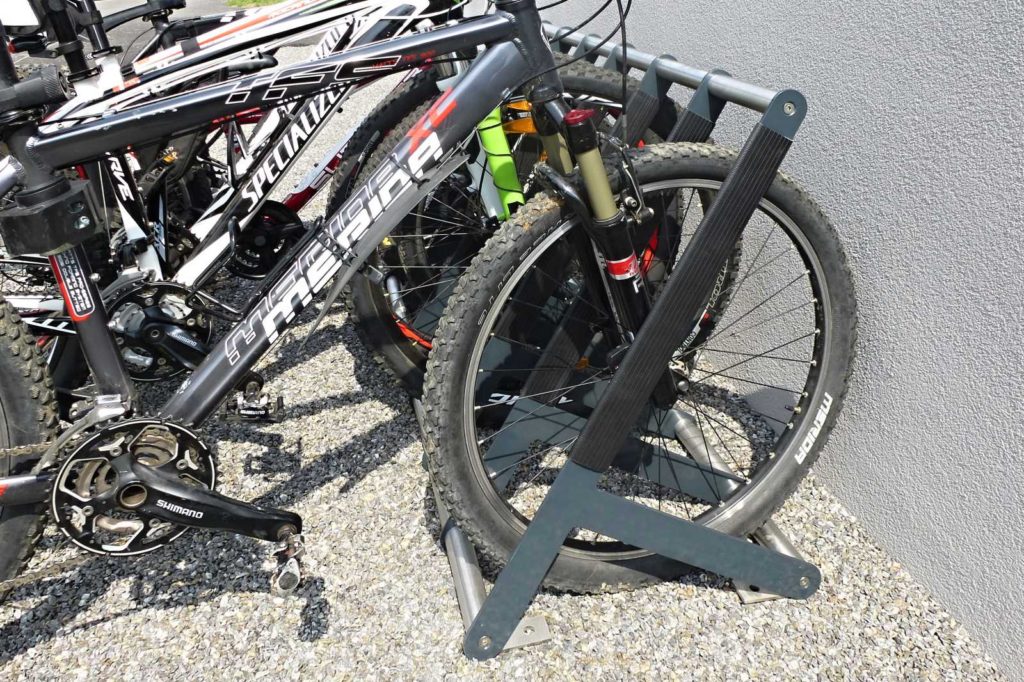A modular parking system for bicycles. This bicycle stand is designed so that a bicycle stands firmly and stably. A durable rubber sleeve protects the paint of the parked bicycles. It is standardly produced for four, six, or eight bicycles. Other parking places can be added upon your request. It is possible to order economical versions without the rubber protection as well.