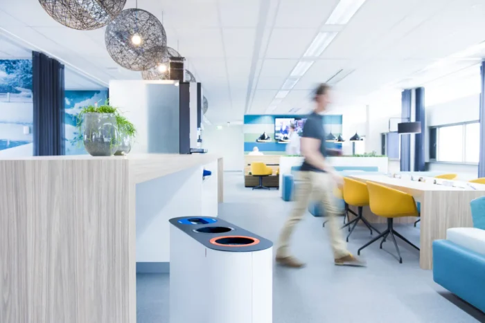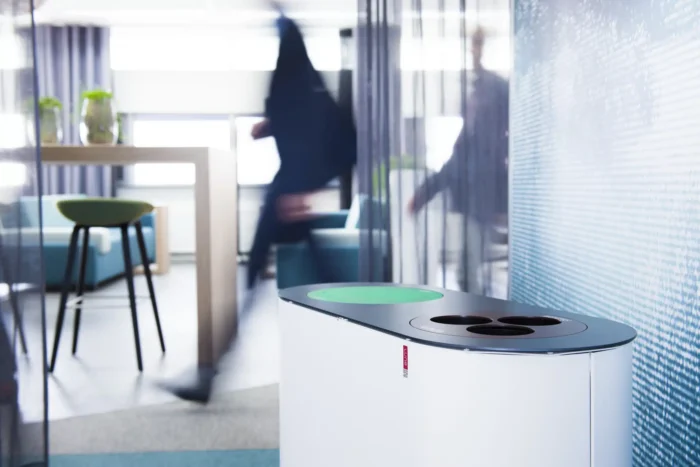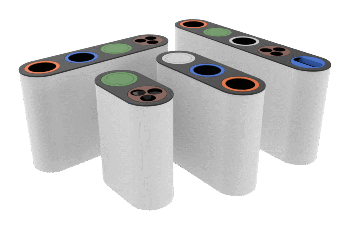 Split litter bins are ergonomic design bins made from high-quality steel. The litter bins feature removable inserts, allowing waste fractions to be changed or varied according to the collection method. The inserts can be powder-coated in separate colors, and text can be optionally added. The text is applied using a silk-screen printing method, making it scratch-resistant.