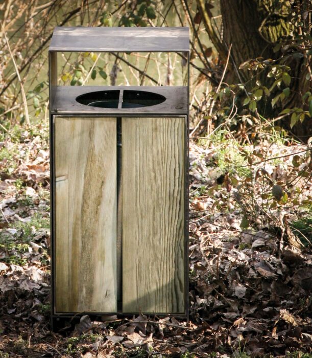 The litter bin is made of a 6mm Corten steel structure with pine wood that has been treated in vacuum pressure autoclave Class IV against woodworm, termites, and insects. It also comes with a galvanized steel inner bin.