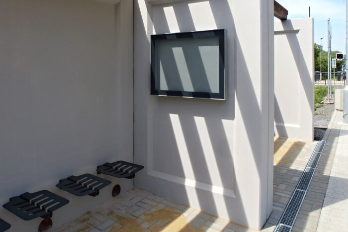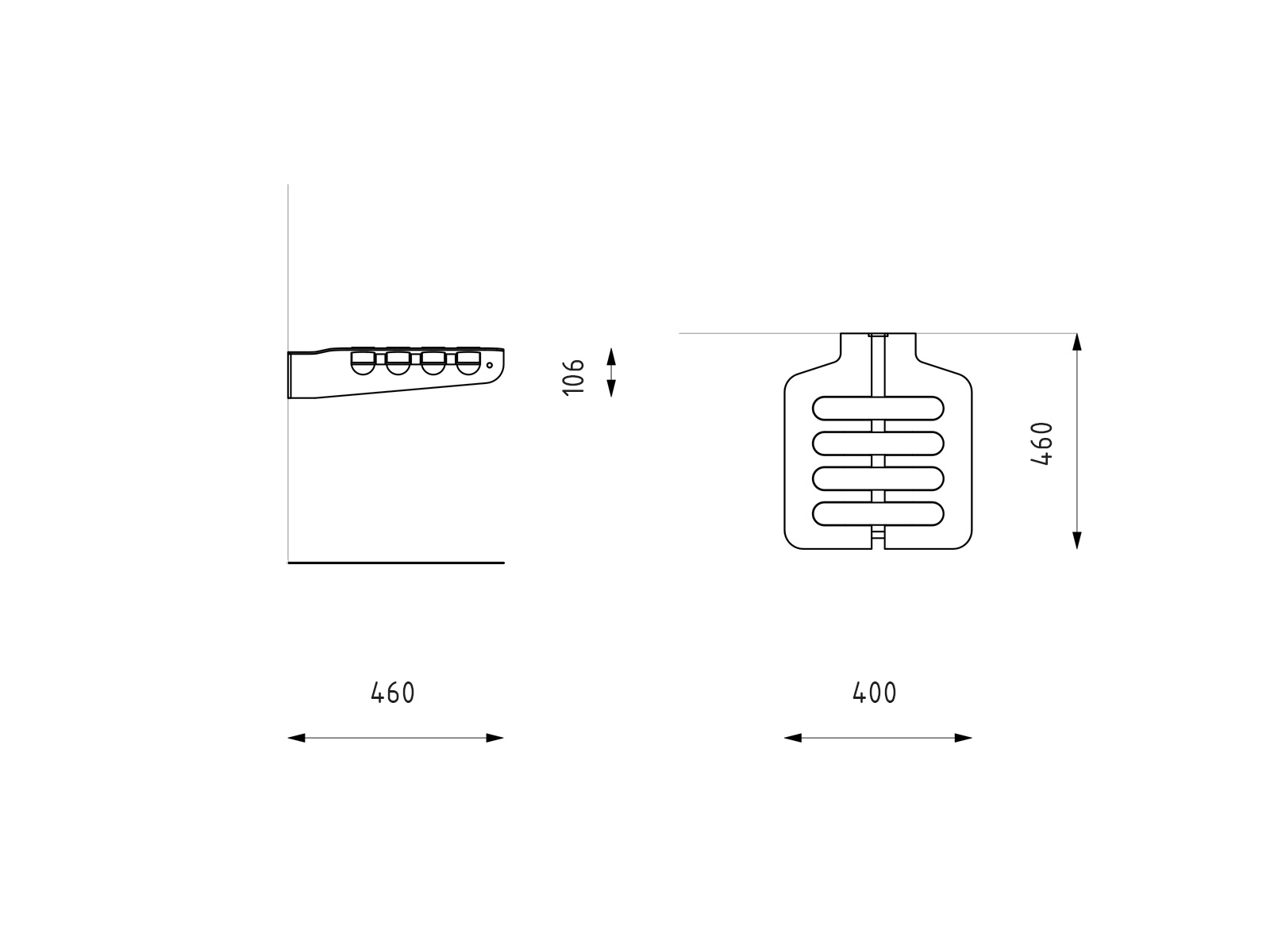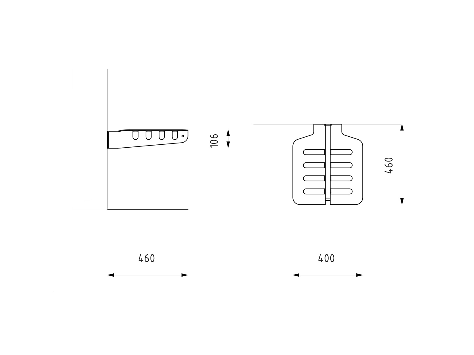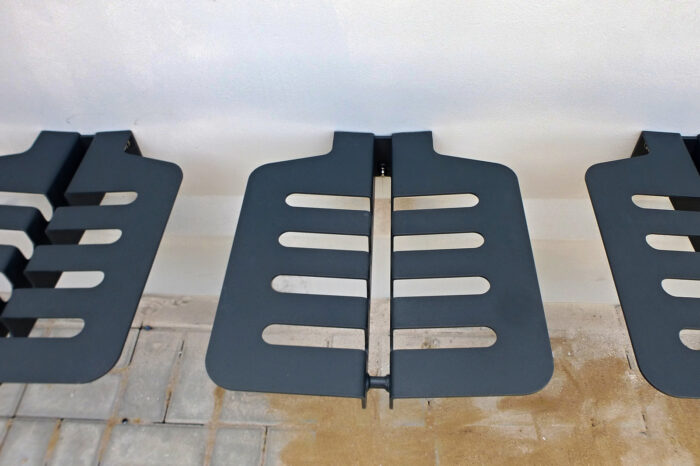 The galvanized steel supporting structure is treated with a powder coating. The seat can be equipped with wood slats, which are attached to the supporting structure with stainless steel screws. In the back, there is a plate with three holes for anchoring to the wall.