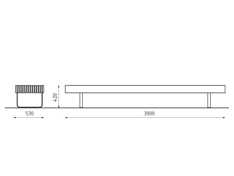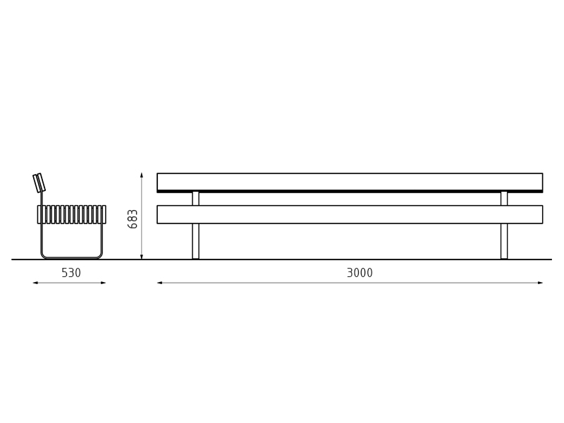 The supporting structure made of galvanized steel is treated with powder coating. A seat and backrest are consisted of solid wooden boards that are attached to the supporting structure with stainless threaded rods and screws. At the bottom part, there are four holes for anchoring to the base.