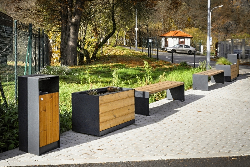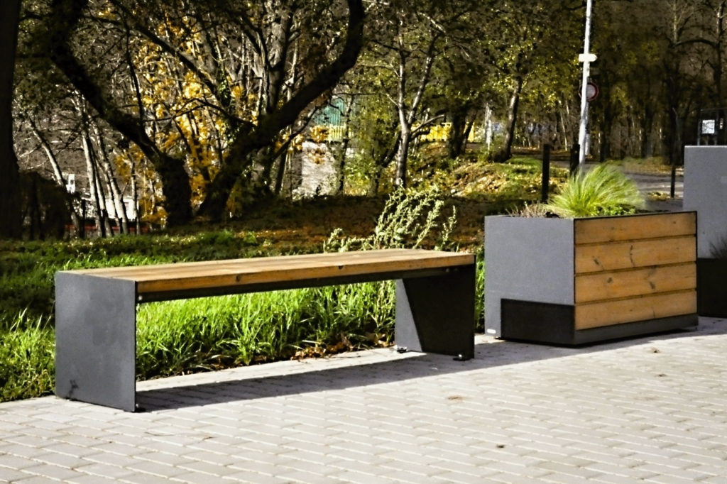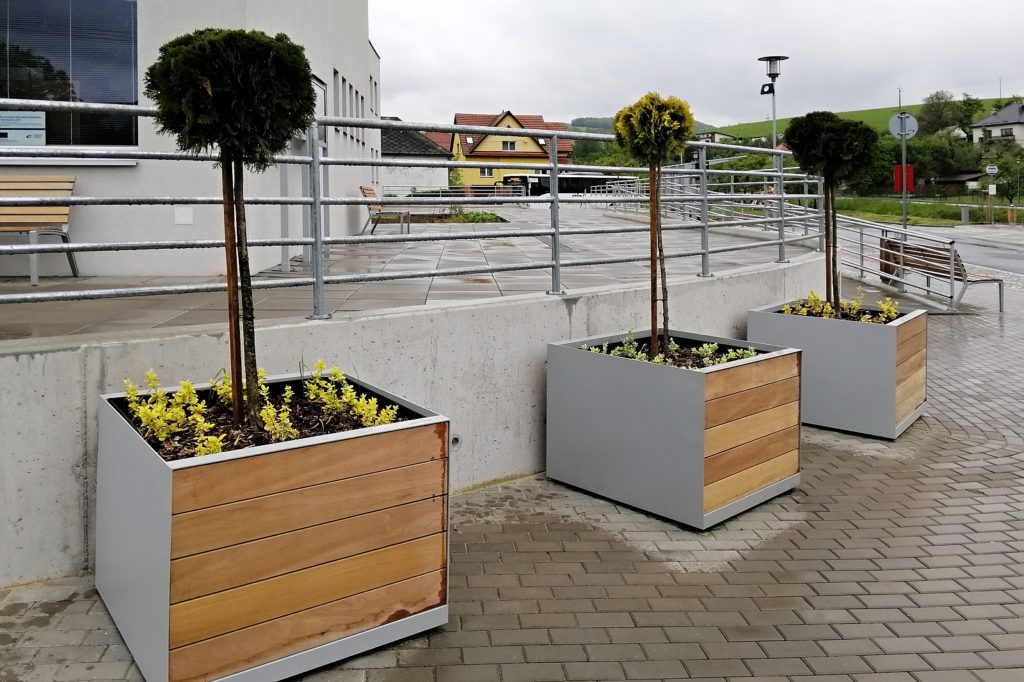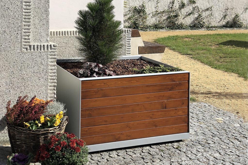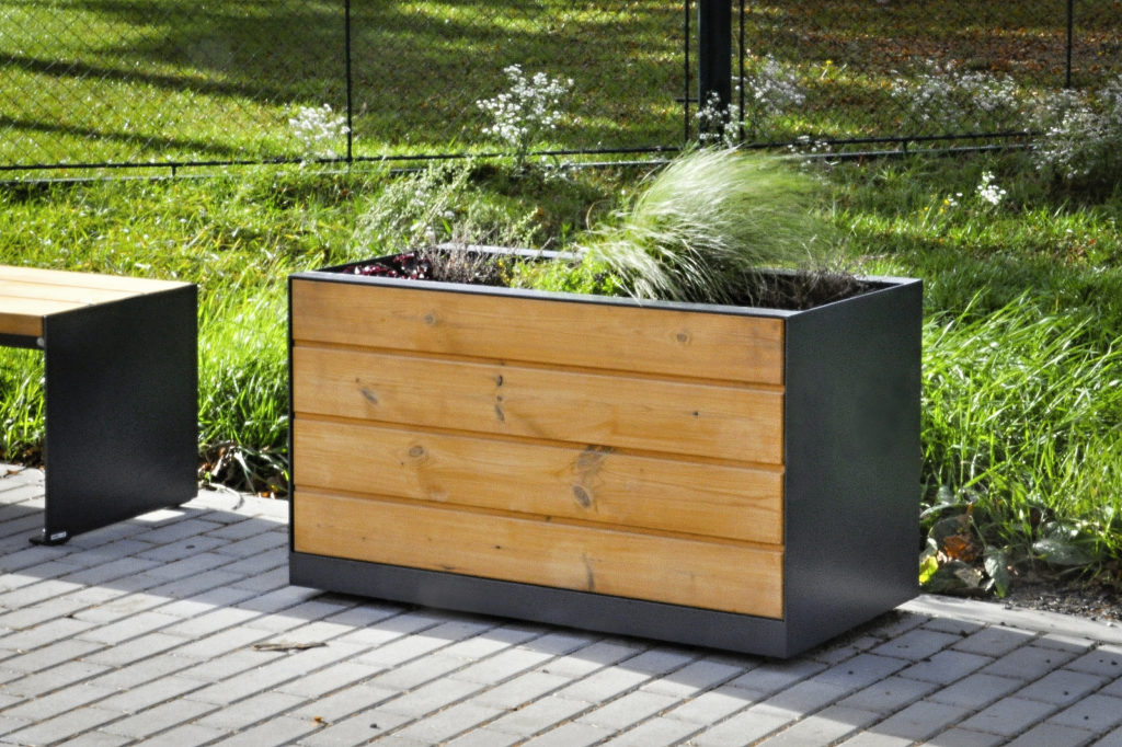 The supporting structure made of galvanized steel is treated with powder coating. The paneling is consisted of solid wooden battens attached to the supporting structure with stainless screws, or galvanized sheet metal, alternatively made from stretched metal sheet treated with powder coating. An inner polypropylene container is provided with overflowing holes in order to prevent plants from their possible overwatering. There are four legs in the corners of the container used for firm placing on the base.
