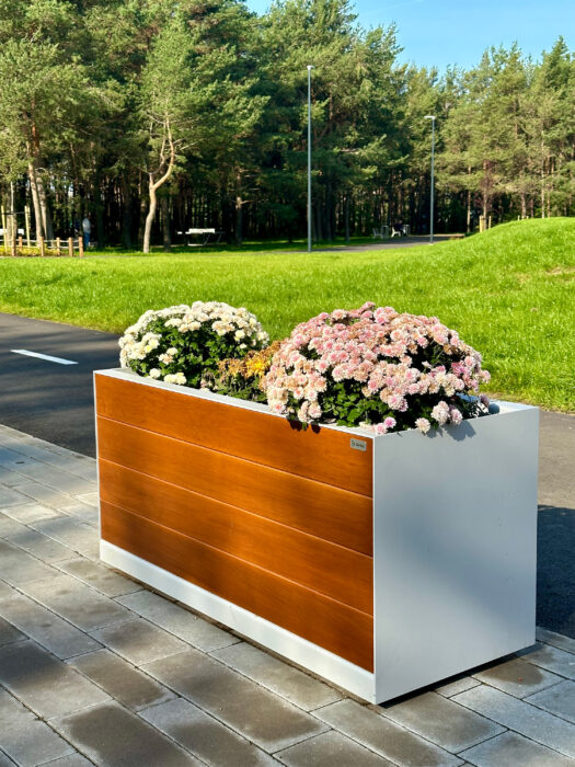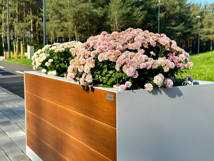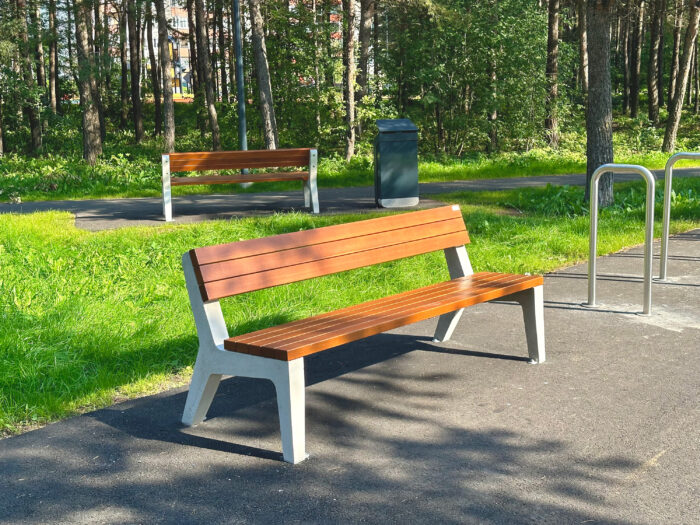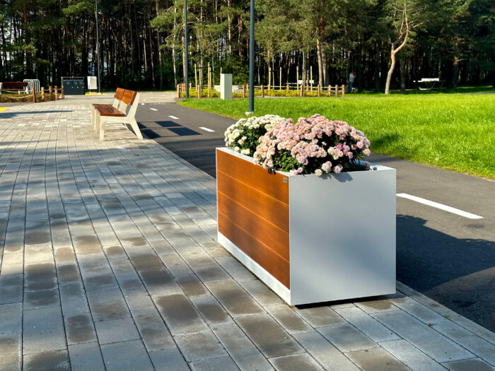 In Seli forest park, you will find many comfortable and stylish BETLA park benches where you can sit and enjoy the fresh air. In addition, modern PETA plant containers decorate roadsides and act as a border for the park. The structure of both benches and plant containers is made of light concrete and covered with a soft wood finish.
